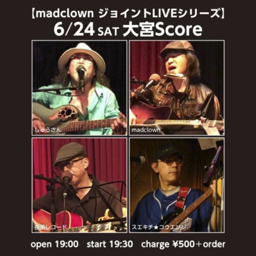 大宮Scoreでライブなのです。このような、だいそれたフライヤーも作ってしまったのです。でもまあ肩の力抜いて、のほほんと唄いたいと思うなり♪6/24(土)大宮Score http://gakuondan.com/score.html 【madclown ジョイントLIVEシリーズ】 出演…madclown wit…